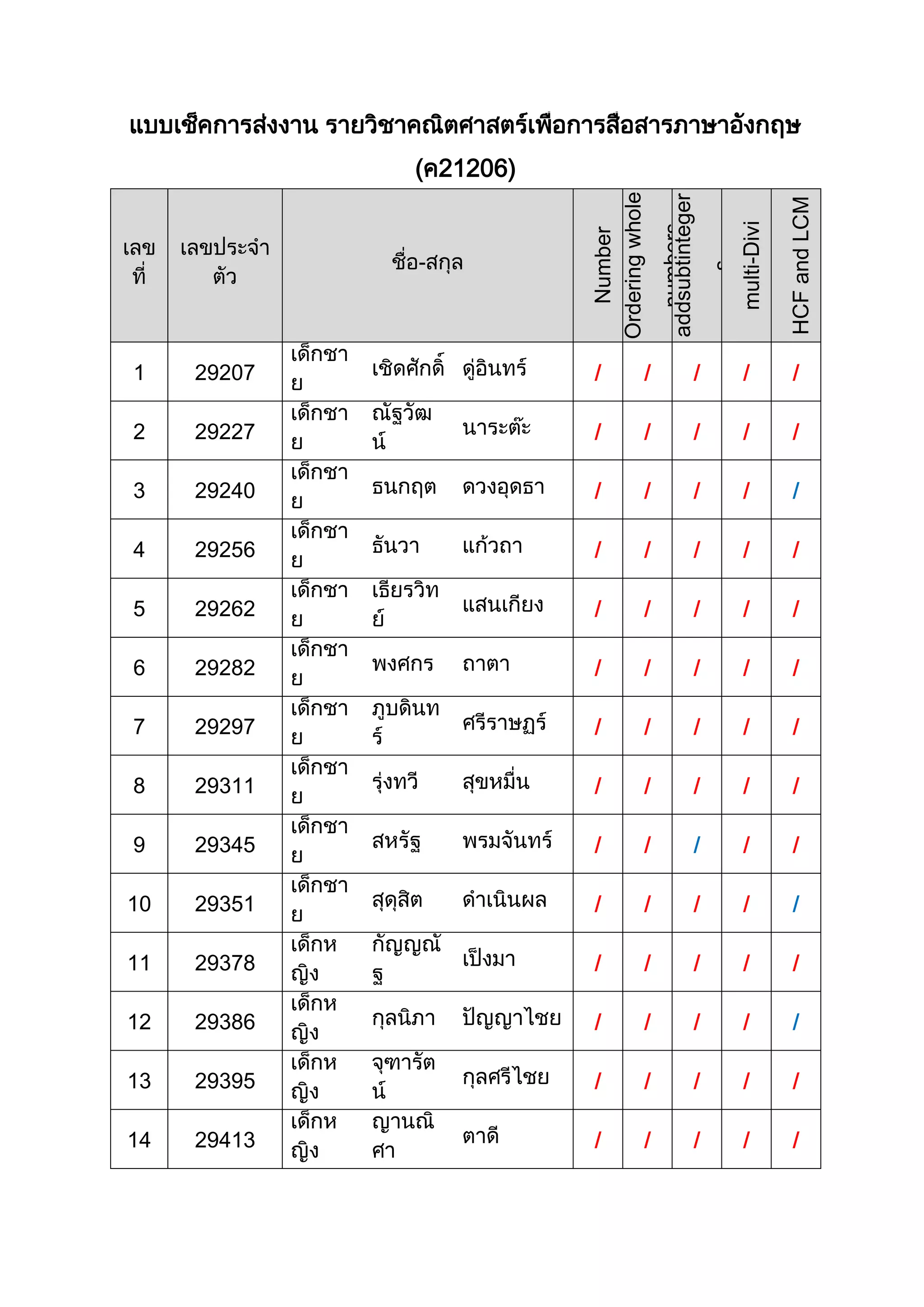 แบบเช็คการส่งงาน รายวิชาคณิตศาสตร์เพื่อการสื่อสารภาษาอังกฤษ
