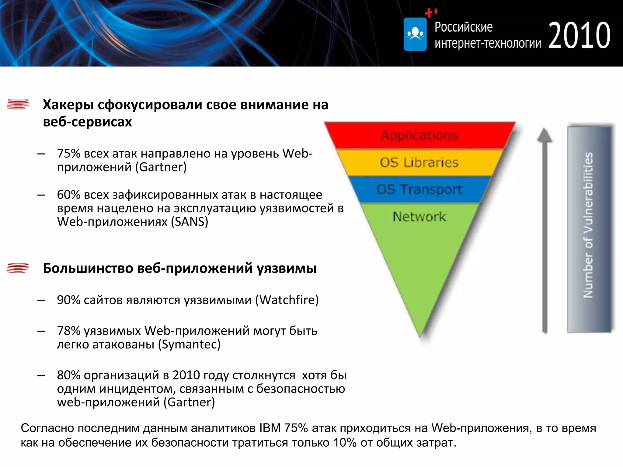 Документ предоставляет анализ защищенности интернет-проектов, подчеркивая, что 75% атак нацелены на уровень веб-приложений и большинство из них уязвимы. Он описывает динамику уязвимостей и предлагает различные подходы к их обнаружению и устранению, включая методы тестирования и анализа кода. Также упоминаются общие статистические данные о взломах и недостатках в безопасности веб-приложений.