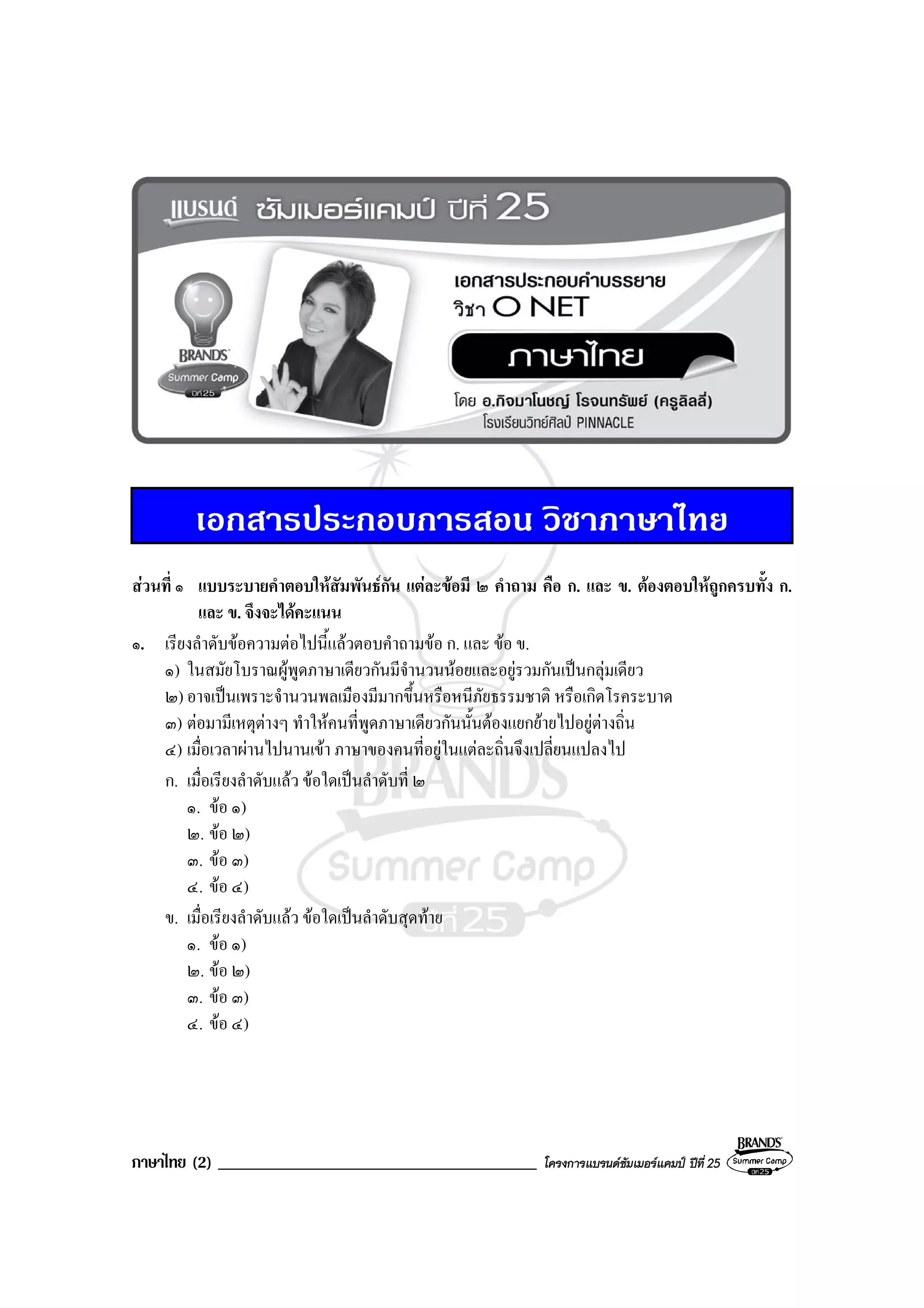 ปที่ 25 50. ขอใดมาจากภาษาสันสกฤตทุกคํา 1) อวตาร นฤโฆษ นิคหิต 2) สมัคร ปรมัตถ หรรษา 3) มัคนายก อวกาศ ทรรศนะ 4) มัธยัสถ เกศินี ทิฐิ 5) อัศจรรย พจนารถ ปรัชญา 51. คําภาษาอังกฤษในขอใดใชคําไทยแทนไมได 1) บริกรกําลังยืนรับออเดอรอยูที่โตะลูกคา 2) ผูที่พูดตามสคริปตยอมคิดอะไรเองไมเปน 3) เธอกินเบคอนทุกวันอยางนี้จะไมอวนไดอยางไร 4) บริษัทจะจัดงานใหญมีการประกวดออกแบบโลโกใหมของบริษัทดวย 5) เราอยูมหาวิทยาลัยเดียวกันแตตางแคมปสจึงไมคอยไดพบกัน 52. คําในขอใดสามารถใชไดมากกวาหนึ่งความหมายทุกคํา 1) แกวตา เพื่อนบาน แมพิมพ 2) ทองแท ลูกเลี้ยง เรือพวง 3) งูพิษ แถวหนา รถยก 4) มือตก เสาหลัก เรือจาง 5) ขายเสียง เปดใจ รอนตัว 53. คําประพันธตอไปนี้ตรงกับสํานวนไทยในขอใด “ความรักขุนแผนก็แสนรัก ดวยรวมยากมานักไมเดียดฉันท สูลําบากบุกปามาดวยกัน สารพันอดออมถนอมใจ ขุนชางแตอยูดวยกันมา คําหนักหาไดวาใหเคืองไม เงินทองกองไวมิใหใคร ขาไทใชสอยเหมือนของตัว” 1) ปากอยางใจอยาง 2) รักพี่เสียดายนอง 3) ไมหลักปกเลน 4) เลือกนักมักไดแร 5) บัวไมใหช้ํา น้ําไมใหขุน 54. ขอใดเปนประโยคความซอน 1) แตเดิมการจัดฟนมีจุดมุงหมายเพื่อการรักษา 2) พอแมมักไดรับคําขอจากลูกๆ ใหพาไปจัดฟน 3) ปจจุบันการจัดฟนกลายเปนแฟชั่นอยางหนึ่ง 4) วัยรุนนิยมติดเครื่องมือจัดฟนแบบยางรัด 5) เครื่องจัดฟนแบบยางรัดมีสีสันสดใส