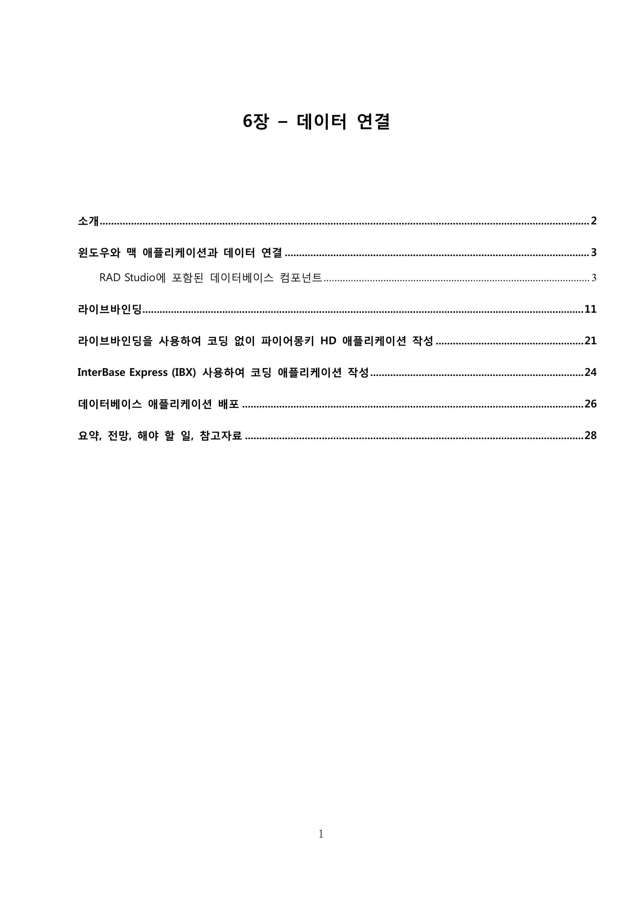 6장에서는 RAD Studio의 새로운 라이브바인딩 기능에 대해 배웠습니다. 또한 데이터베이스에 연결하는