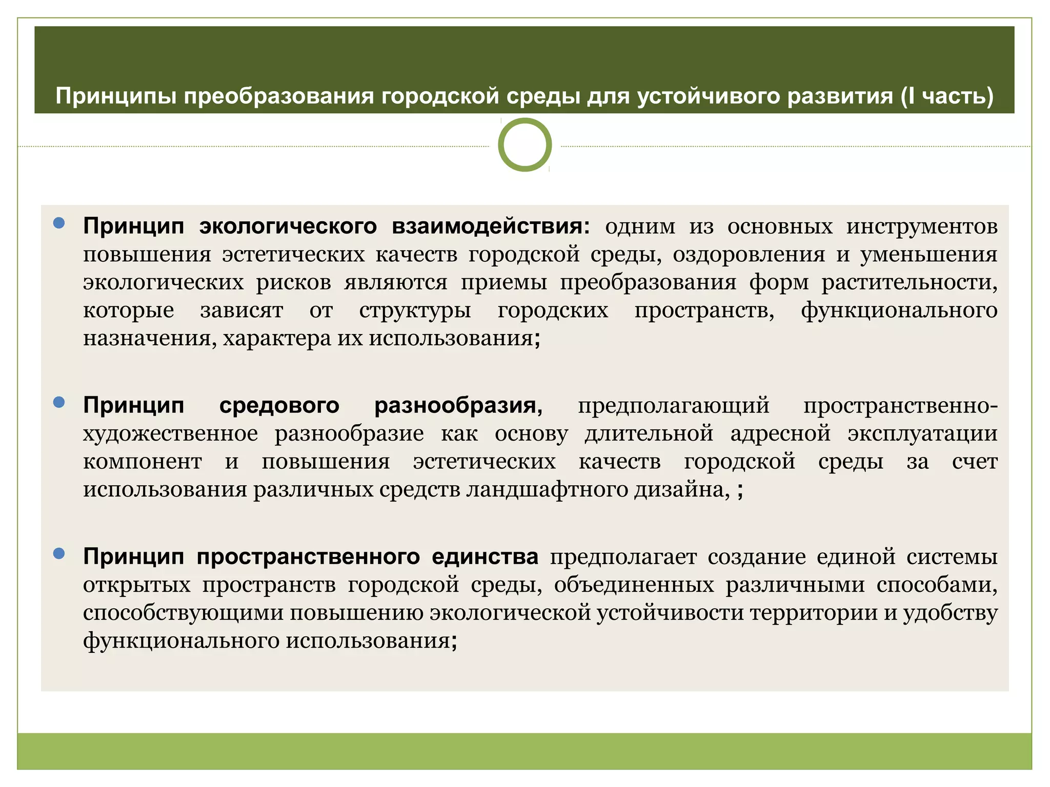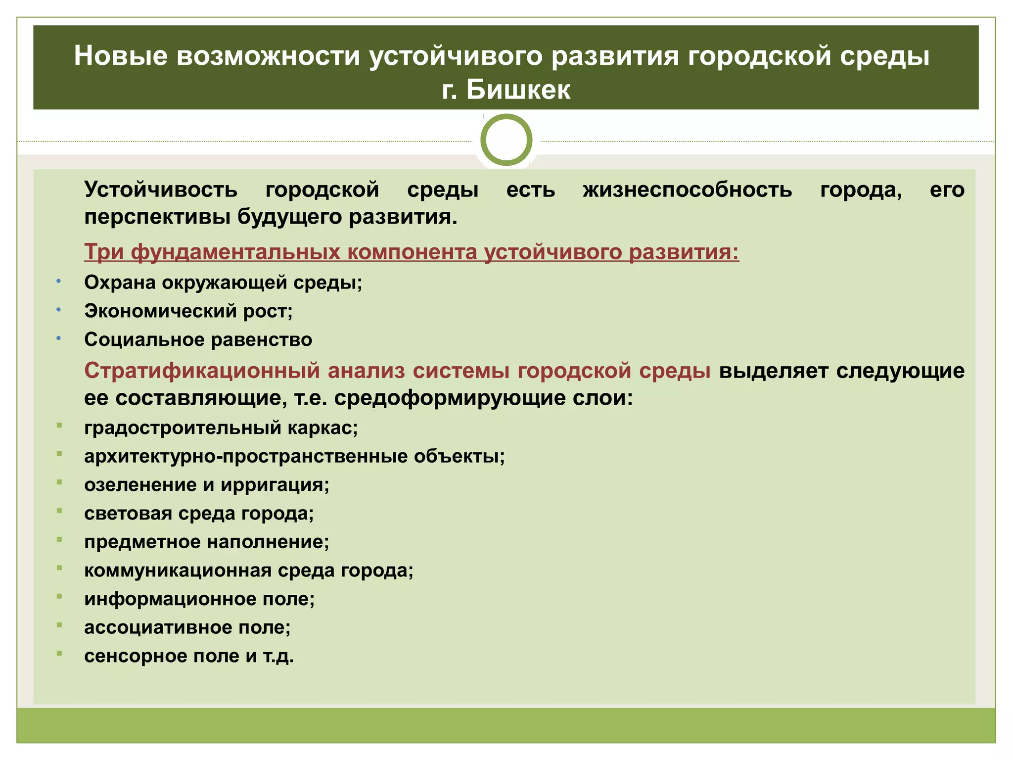 Документ представляет концепцию устойчивого развития городской среды города Бишкек, выделяя ключевые принципы, такие как экологическое взаимодействие, социальная адресность и экономическая привлекательность. Он отмечает важность преобразования городской среды, использование инновационных решений и создание многоуровневых пространств с учетом ландшафта и социальной структуры. Приводятся примеры проектирования набережных и карьеров, а также элементы дизайна, направленные на создание гармоничной и устойчивой городской среды.