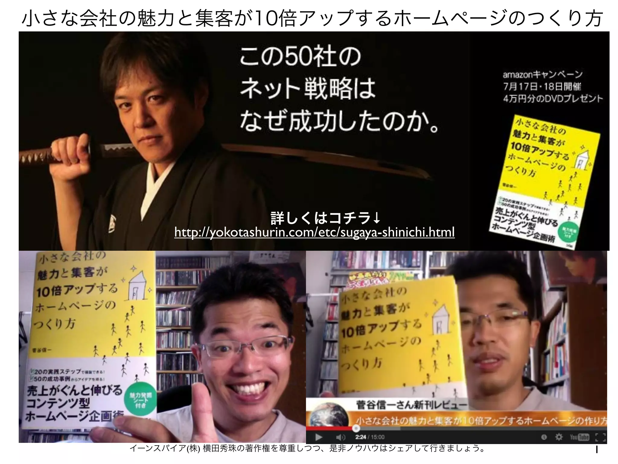 小さな会社の魅力と集客が10倍アップするホームページのつくり方 1イーンスパイア(株) 横田秀珠の著作権を尊重しつつ、是非ノウハウはシェアして行きましょう。 http://yokotashurin.com/etc/sugaya-shinichi.html 詳しくはコチラ↓