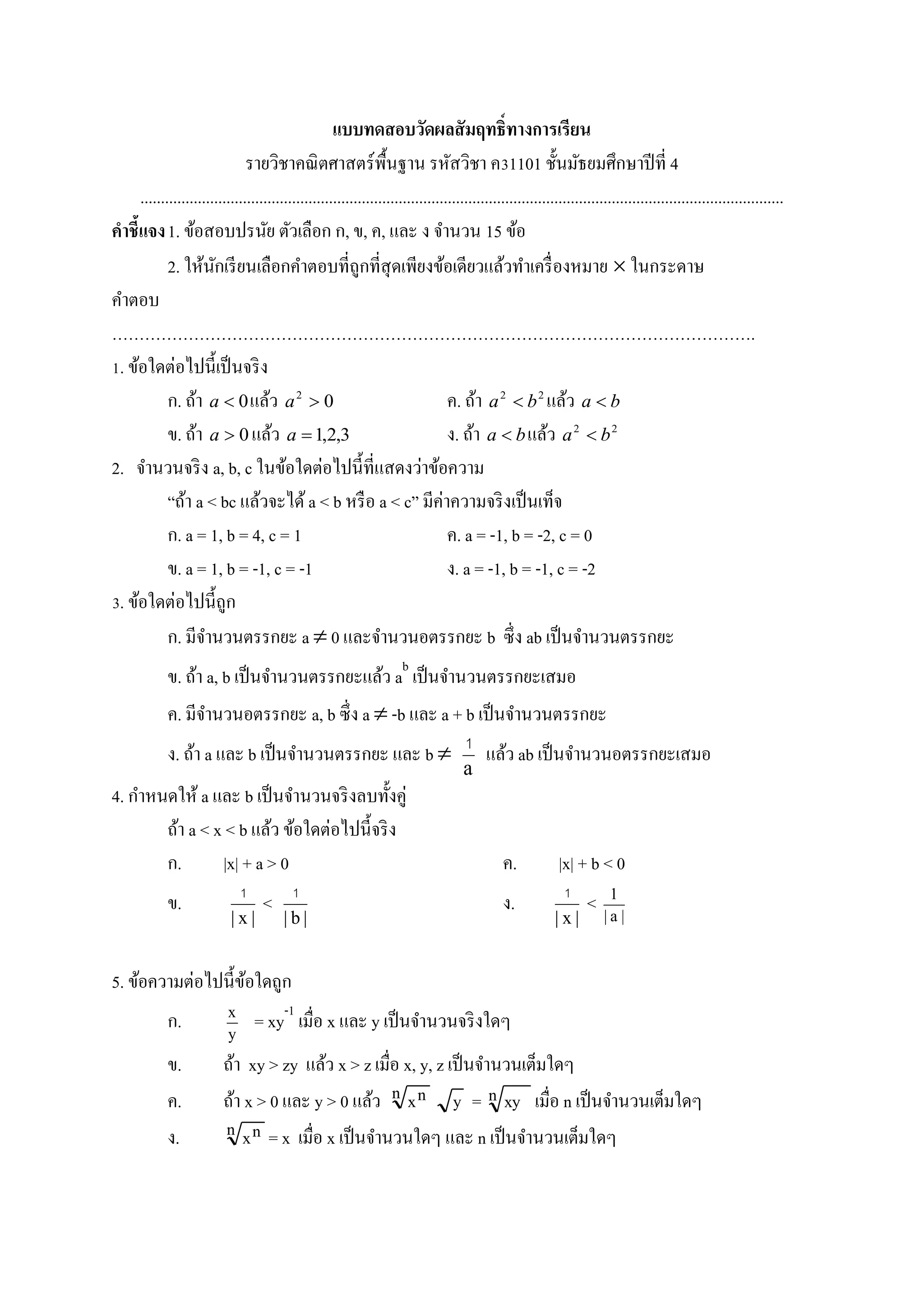 คาชี้แจง1. ข้อสอบปรนัย ตัวเลือก ก, ข, ค, และ ง จานวน 15 ข้อ