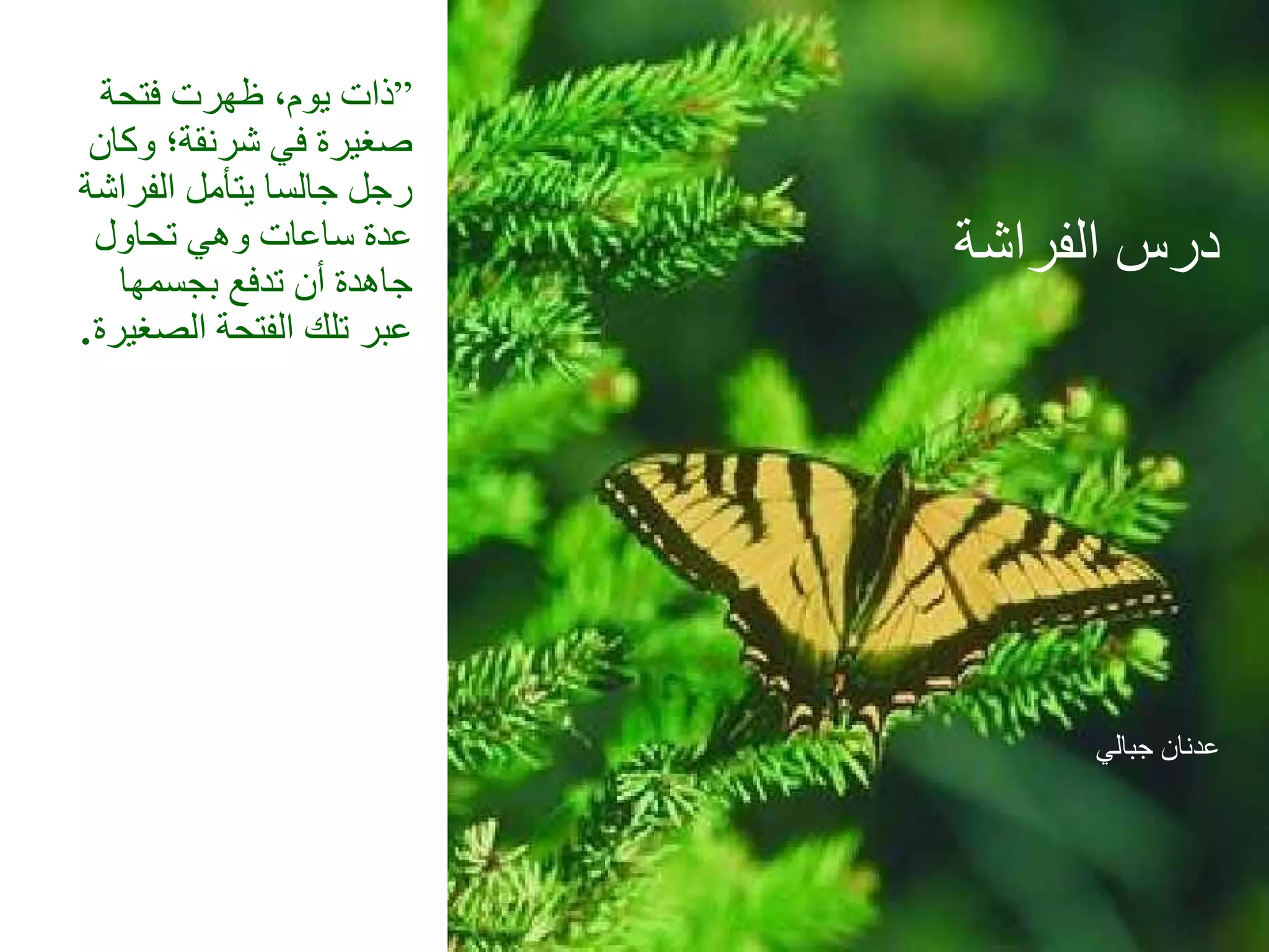 تتناول الوثيقة قصة شخص يتأمل فراشة تحاول الخروج من شرنقة، حيث يقرر مساعدتها ولكن يتسبب ذلك في ضعفها وعدم قدرتها على الطيران. توضح القصة أن المعاناة والصعوبات تمنحنا القوة والنمو، وأن الكفاح هو ضروري لتحقيق النجاح والقدرة على مواجهة تحديات الحياة. تشير الوثيقة إلى أن الدعوات للقدرة والإلهام تتجسد غالبًا في مواجهة العقبات وليس في التغاضي عنها.