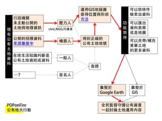 壓力人 得到正確的 公有土地地號 查證 運用GIS地籍圖 查得位置與形狀 方法 機器人 一般人 civic,NGO,代議者 匿名人 彙整於 GIS 彙整於 Google Earth 在地生活知識判斷是 公有土地資訊或資料 公開的招標資料 來源彙整中 行政機關 未主動公開的 土地與地理資訊 …? 現 有 公 有 土 地 資 料 可以匯出 資料表單 或是地圖 可以依條件 檢索出資料 可以夾帶/補充 某筆土地 的更多資料 功 能 期 待 全民監督守護公有資產 一起討論土地運用內容 POPonFire 公有地大行動