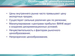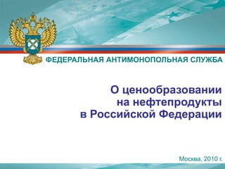 Документ Федеральной антимонопольной службы описывает особенности ценообразования на рынке нефтепродуктов в России, включая влияние крупнейших нефтяных компаний на цены и антимонопольные нарушения. Также рассматриваются предложения по улучшению прозрачности и конкуренции на рынке, включая переход к формульному ценообразованию и необходимость ведения раздельного учета. В заключение, документ отмечает необходимость изменений в законодательстве для поддержки конкуренции и повышения эффективности ценообразования.