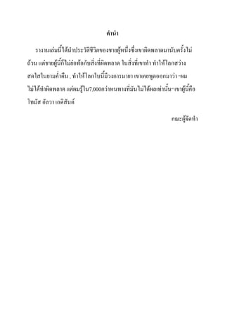 คำนำ รางานเล่มนี้ได้นาประวัติชีวิตของชายผู้หนึ่งซึ่งเขาผิดพลาดมานับครั้งไม่ ถ้วน แต่ชายผู้นี้ก็ไม่ย่อท้อกับสิ่งที่ผิดพลาด ในสิ่งที่เขาทา