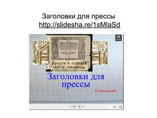 Документ содержит советы по созданию заголовков для интернета и печатных материалов, включая критерии их проверки. Упоминаются различные платформы, такие как RSS, Facebook и Twitter, как средства распространения информации. Также рассматриваются элементы, которые делают заголовок более привлекательным и информативным.