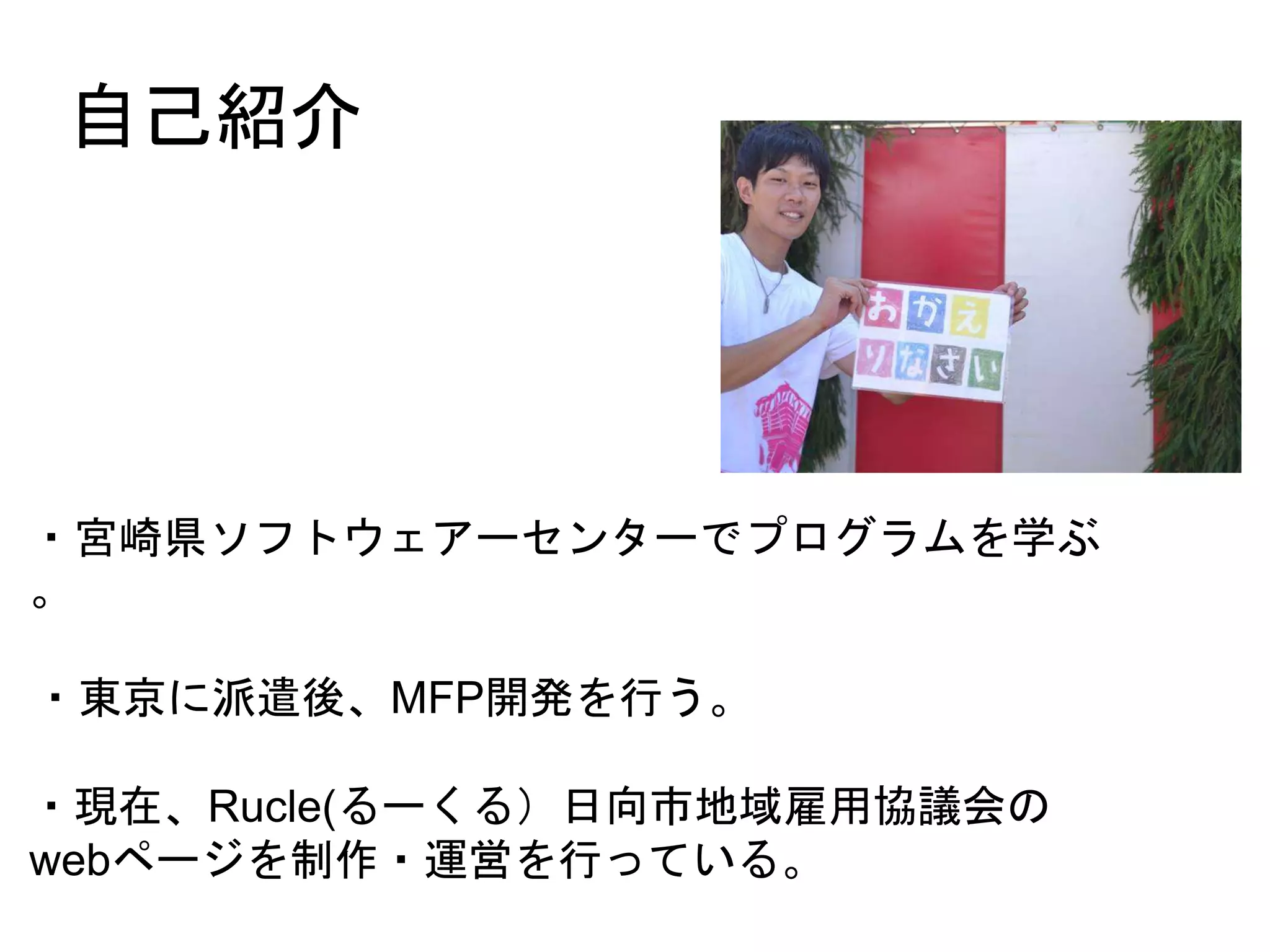 ・宮崎県ソフトウェアーセンターでプログラムを学ぶ 。 ・東京に派遣後、MFP開発を行う。 ・現在、Rucle(るーくる)日向市地域雇用協議会の webページを制作・運営を行っている。 自己紹介