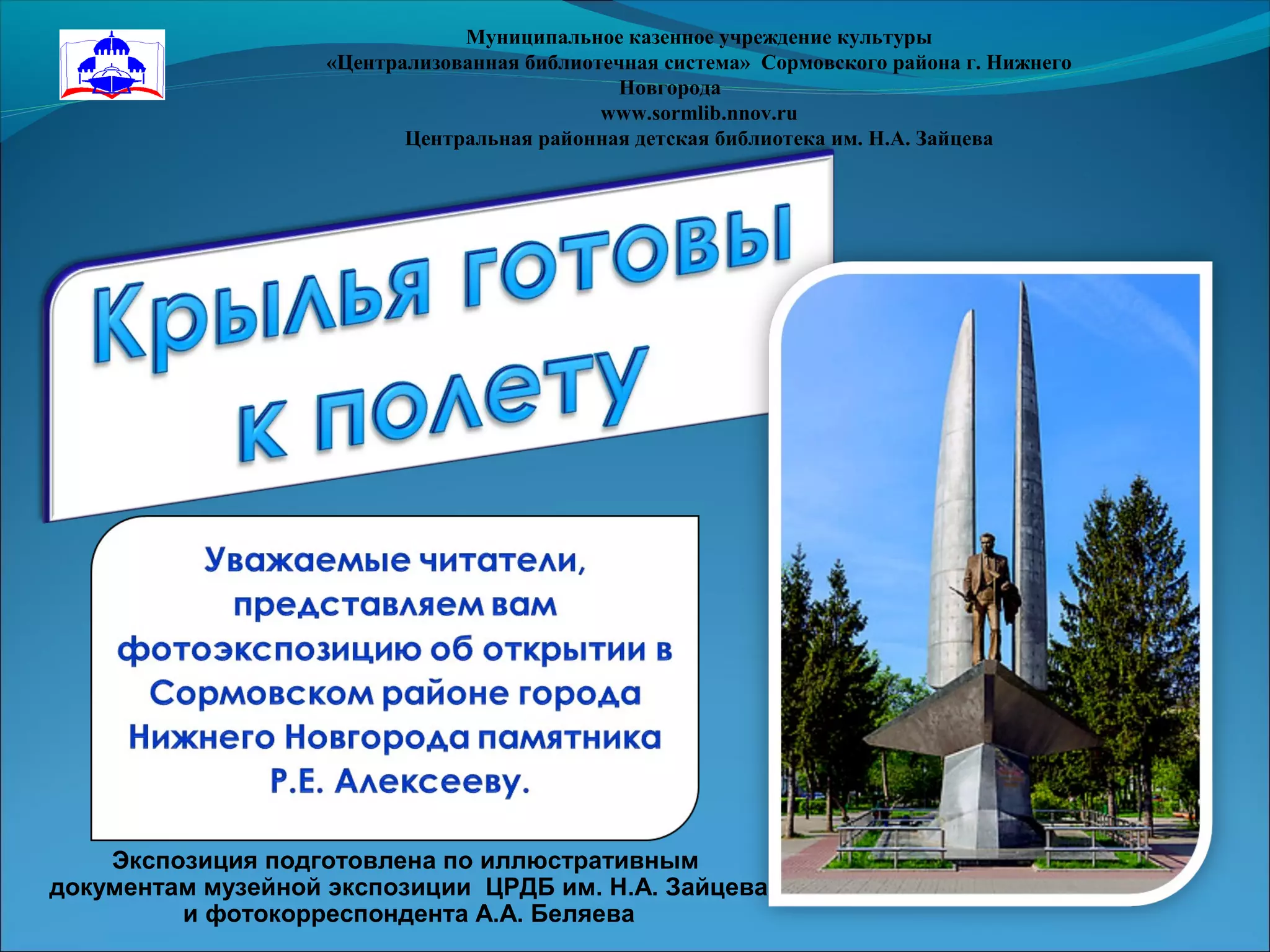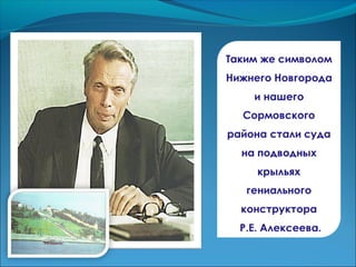 Документ описывает открытие памятника Ростиславу Алексееву в Сормове, который первенствовал в создании скоростных пассажирских судов на подводных крыльях. Памятник состоит из динамической фигуры конструктора и стилизованных колонн, символизирующих паруса. Торжественное открытие состоялось с участием губернатора и других почетных гостей.