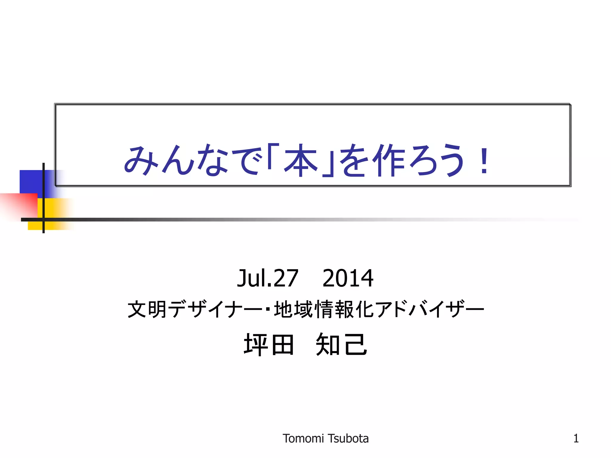 7/27開催の地域起業をとことん考えるアイデアソン2014の中で、話題提供ということで好齢ビジネスパートナーズ世話人堀池喜一郎から「「地域で起業する」と「支援する」を合流させるヒント〜三鷹の特長とコミュニティビジネス〜」というお話いただきました。その資料です。 「地域起業をとことん考えるアイデアソン2014」案内 http://www.korei-bp.com/archives/info/07cafe 「地域起業をとことん考えるアイデアソン2014」レポート