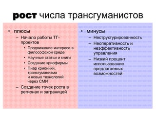 Документ обсуждает ход реформы трансгуманизма и крионики, акцентируя внимание на прогрессе в области создания организаций и проектов, а также на необходимых регистрациях и членствах. Он выделяет плюсы, такие как рост интереса и создание новых проектов, и минусы, включая неструктурированность управления и низкое вовлечение. Основное внимание уделяется необходимости создания структурированной организации и активных действий членов.