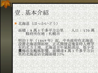 北海道是日本面積最大且擁有豐富農林水產資源的地區,氣候清涼,擁有多處自然景觀及旅遊勝地。當地飲食文化豐富,包括有名的拉麵、蕎麥及海鮮美食,特產如牛肉和各種水果也頗具盛名。日本的政治、宗教和交通系統多樣,體現了其獨特的文化特色。