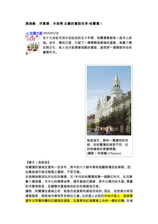 哈爾濱是北國的童話世界,融合了俄式建築特色和中西文化,歷經多次歷史變遷與城市規劃影響。城市以其獨特的街道佈局及色彩繽紛的木刻楞房著稱,這些建築反映了俄羅斯的建築風格以及中國的地方特色。儘管曾遭受破壞,現有的俄式建築仍散發著歷史的韻味,讓人憧憬過去的風華年代。