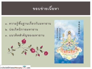 ดาวน์โหลดไฟล์นี้ได้ที่ www.philosophychicchic.com บทที่ ๑ ความรู้พื้นฐานและบ่อเกิดพระพุทธศาสนามหายาน ขอบข่ายเนื้อหา ความรู้พื้นฐานเกี่ยวกับมหายาน บ่อเกิดนิกายมหายาน แนวคิดสำคัญของมหายาน