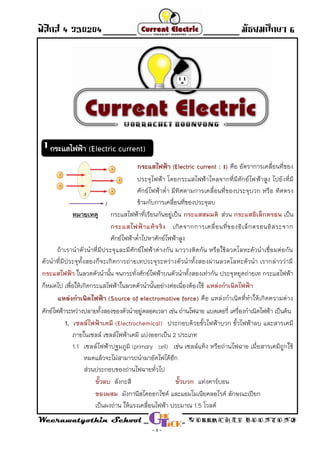 - Direct Current - มัธยมศึกษา 6 Weerawatyothin School WORRACHET BOONYONG - 1 - กระแสไฟฟ้า (Electric current : I) คือ อัตราการเคลื่อนที่ของ ประจุไฟฟ้า โดยกระแสไฟฟ้าไหลจากที่มีศักย์ไฟฟ้าสูง ไปยังที่มี ศักย์ไฟฟ้าต่่า มีทิศตามการเคลื่อนที่ของประจุบวก หรือ ทิศตรง ข้ามกับการเคลื่อนที่ของประจุลบ หมายเหตุ กระแสไฟฟ้าที่เรียนกันอยู่เป็น ส่วน เป็นกระแสสมมติ กระแสอิเล็กตรอน เกิดจากการเคลื่อนที่ของอิเล็กตรอนอิสระจากกระแสไฟฟ้าแท้จริง ศักย์ไฟฟ้าต่่าไปหาศักย์ไฟฟ้าสูง ถ้าเราน่าตัวน่าที่มีประจุและมีศักย์ไฟฟ้าต่างกัน มาวางติดกัน หรือใช้ลวดโลหะตัวน่าเชื่อมต่อกัน ตัวน่าที่มีประจุทั้งสองก็จะเกิดการถ่ายเทประจุระหว่างตัวน่าทั้งสองผ่านลวดโลหะตัวน่า เรากล่าวว่ามี ในลวดตัวน่านั้น จนกระทั่งศักย์ไฟฟ้าบนตัวน่าทั้งสองเท่ากัน ประจุหยุดถ่ายเท กระแสไฟฟ้ากระแสไฟฟ้า ก็หมดไป เพื่อให้เกิดกระแสไฟฟ้าในลวดตัวน่านั้นอย่างต่อเนื่องต้องใช้ แหล่งกาเนิดไฟฟ้า แหล่งกาเนิดไฟฟ้า (Source of electromotive force) คือ แหล่งก่าเนิดที่ท่าให้เกิดความต่าง ศักย์ไฟฟ้าระหว่างปลายทั้งสองของตัวน่าอยู่ตลอดเวลา เช่น ถ่านไฟฉาย แบตเตอรี่ เครื่องก่าเนิดไฟฟ้า เป็นต้น 1. เซลล์ไฟฟ้าเคมี (Electrochemical) ประกอบด้วยขั้วไฟฟ้าบวก ขั้วไฟฟ้าลบ และสารเคมี ภายในเซลล์ เซลล์ไฟฟ้าเคมี แบ่งออกเป็น 2 ประเภท 1.1 เซลล์ไฟฟ้าปฐมภูมิ (primary cell) เช่น เซลล์แห้ง หรือถ่านไฟฉาย เมื่อสารเคมีถูกใช้ หมดแล้วจะไม่สามารถน่ามาอัดไฟได้อีก ส่วนประกอบของถ่านไฟฉายทั่วไป สังกะสี แท่งคาร์บอนขั้วลบ ขั้วบวก มังกานีสไดออกไซด์ และแอมโมเนียคลอไรด์ ลักษณะเปียกของผสม เป็นผงถ่าน ให้แรงเคลื่อนไฟฟ้า ประมาณ 1.5 โวลต์ กระแสไฟฟ้า (Electric current)1