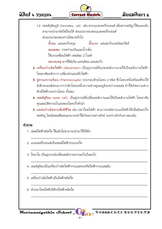 - Direct Current - มัธยมศึกษา 6 Weerawatyothin School WORRACHET BOONYONG - 5 - 1. ถ้าประจุไฟฟ้าที่ไหลผ่านลวดตัวน่าหนึ่งในเวลา 2 นาที เท่ากับ 600 ไมโครคูลอมบ์ กระแสไฟฟ้าที่ไหล ผ่านลวดตัวน่านี้จะมีค่ากี่แอมแปร์ วิธีทา ______________________________________________________________________________________ ______________________________________________________________________________________ ______________________________________________________________________________________ ______________________________________________________________________________________ ______________________________________________________________________________________ ______________________________________________________________________________________ 2. ถ้าปริมาณประจุไฟฟ้าที่ผ่านหลอดไฟใน 1 นาที เท่ากับ 120 ไมโครคูลอมบ์ กระแสไฟฟ้าที่ไหลผ่าน หลอดไฟมีค่ากี่แอมแปร์ วิธีทา ______________________________________________________________________________________ ______________________________________________________________________________________ ______________________________________________________________________________________ ______________________________________________________________________________________ ______________________________________________________________________________________ ______________________________________________________________________________________ ______________________________________________________________________________________ 3. ถ้ามีกระแสไฟฟ้า1.25 แอมแปร์ ในเส้นลวดโลหะเส้นหนึ่ง ประจุไฟฟ้าทั้งหมดที่ผ่านพื้นที่หน้าตัดของ เส้นลวดโลหะนั้นในเวลา 5 นาที จะมีค่าเท่าไร วิธีทา ______________________________________________________________________________________ ______________________________________________________________________________________ ______________________________________________________________________________________ ______________________________________________________________________________________ ______________________________________________________________________________________ ______________________________________________________________________________________ ______________________________________________________________________________________ โจทย์ปัญหา กระแสไฟฟ้า
