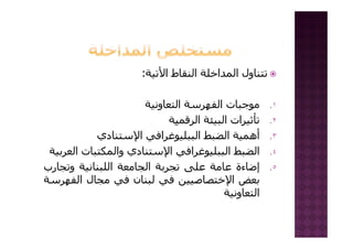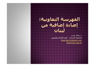 الفهرسة التعاونية : إضائة إضافية من لبنان / د. عماد بشير (الجامعة اللبنانية، كلية الإعلام والتوثيق) ملتقى أعضاء الفهرس العربي المنعقد بمدينة الرياض الفترة 25-26 جمادى الآخرة الموافق 8-9 يونيو 2010