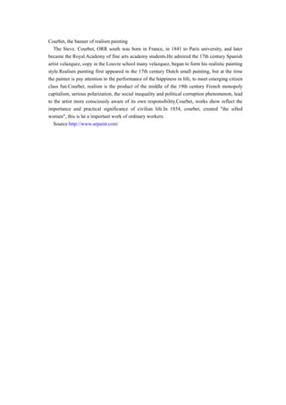 Courbet was a French painter born in 1841 who became known as the banner of realism painting. He admired the works of 17th century Spanish painter Velazquez and copied his works at the Louvre, helping form his own realistic painting style. Courbet's realism emerged in 19th century France during a time of growing inequality and corruption, and his works reflected on the importance of everyday civilian life, such as his 1854 painting "The Stone Breakers" depicting ordinary workers.