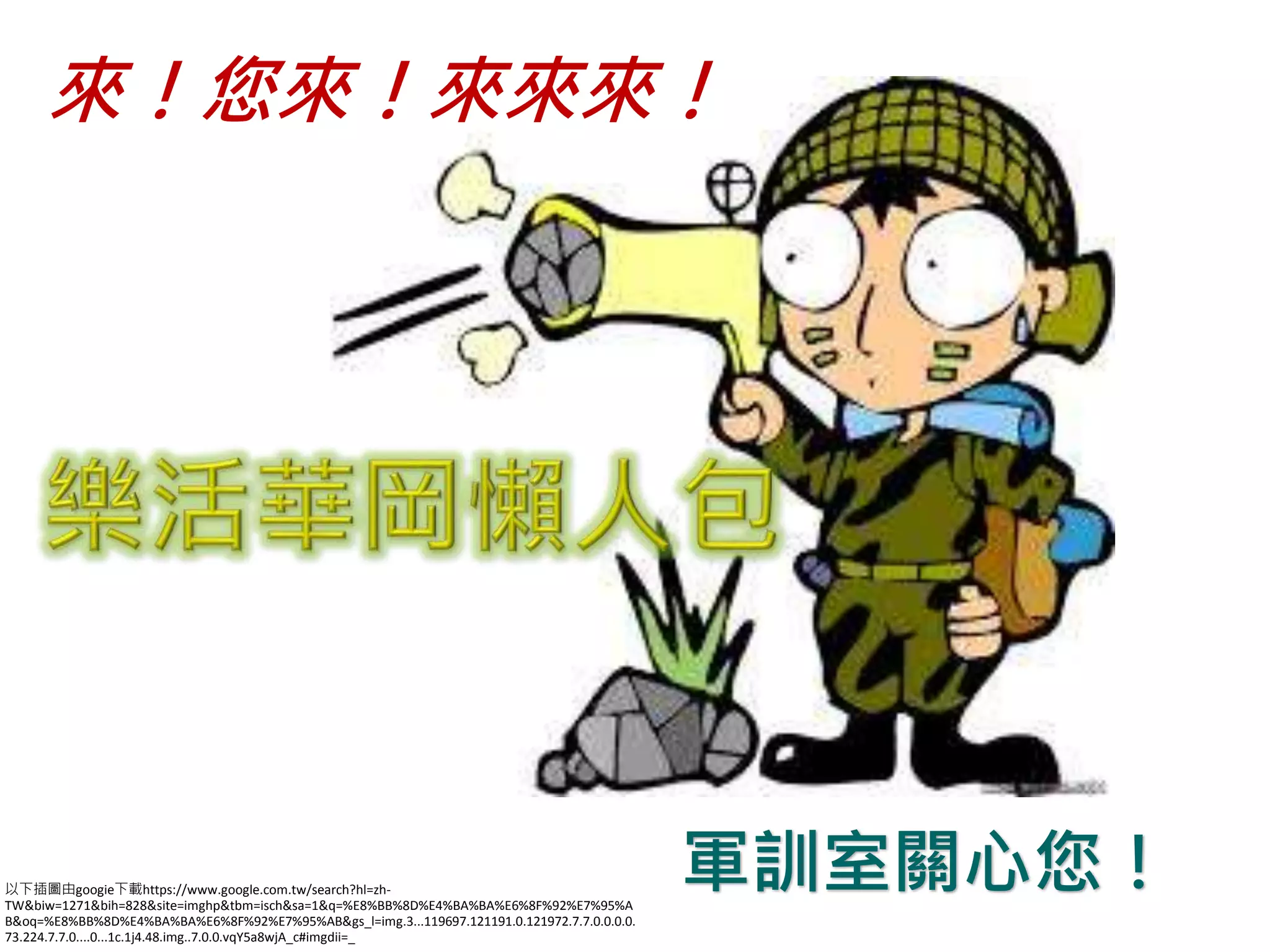 來!您來!來來來! 軍訓室關心您!以下插圖由googie下載https://www.google.com.tw/search?hl=zh- TW&biw=1271&bih=828&site=imghp&tbm=isch&sa=1&q=%E8%BB%8D%E4%BA%BA%E6%8F%92%E7%95%A B&oq=%E8%BB%8D%E4%BA%BA%E6%8F%92%E7%95%AB&gs_l=img.3...119697.121191.0.121972.7.7.0.0.0.0. 73.224.7.7.0....0...1c.1j4.48.img..7.0.0.vqY5a8wjA_c#imgdii=_