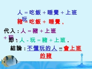 = 會上班的豬 人 = 吃飯 + 睡覺 + 上班 + 玩 , 豬 = 吃飯 + 睡覺 , 代入 : 人 = 豬 + 上班 + 玩 , 即 : 人 - 玩 = 豬 + 上班 .