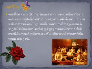 ดนตรีไทย ส่วนใหญ่จะเกี่ยวข้องกับศาสนา