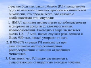 Документ обсуждает интервенционные методы лечения больных раком легкого, подчеркивая сложность заболевания из-за высокой смертности и ограниченной эффективности традиционных методов. Рассматриваются варианты неоадъювантной химиотерапии и совместного применения терапии, которые показали улучшение выживаемости пациентов. Также обсуждаются результаты применения эмболизации бронхиальных артерий и внутриартериальной химиотерапии как эффективных методов в лечении местно распространенного рака легкого.