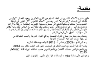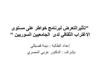 تتناول الوثيقة تأثير برنامج 'خواطر' على المستوى الثقافي والاجتماعي للسوريين الجامعيين خلال فترة الاغتراب. تبحث الدراسة في كيفية تأثير البرنامج على أفكار ووجهات نظر هذه الفئة، وتتناول العلاقة بين التعرض للبرنامج ومستوى الاغتراب الثقافي والاقتصادي. أهمية البحث تكمن في ندرة الدراسات السابقة حول هذا الموضوع وتأثير البرنامج في تعزيز النمو الشخصي والاجتماعي لدى الشباب.