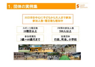 1.団体の実例集 川口市を中心に子どもから大人まで参加川口市を中心に子どもから大人まで参加川口市を中心に子どもから大人まで参加川口市を中心に子どもから大人まで参加 参加人数・種目数も増加中参加人数・種目数も増加中参加人数・種目数も増加中参加人数・種目数も増加中 スポーツ種目数 10種目以上種目以上種目以上種目以上 3年間の参加人数 500人以上人以上人以上人以上 参加者属性 3歳~歳~歳~歳~60歳代まで歳代まで歳代まで歳代まで 協業団体 行政、町会、小学校行政、町会、小学校行政、町会、小学校行政、町会、小学校