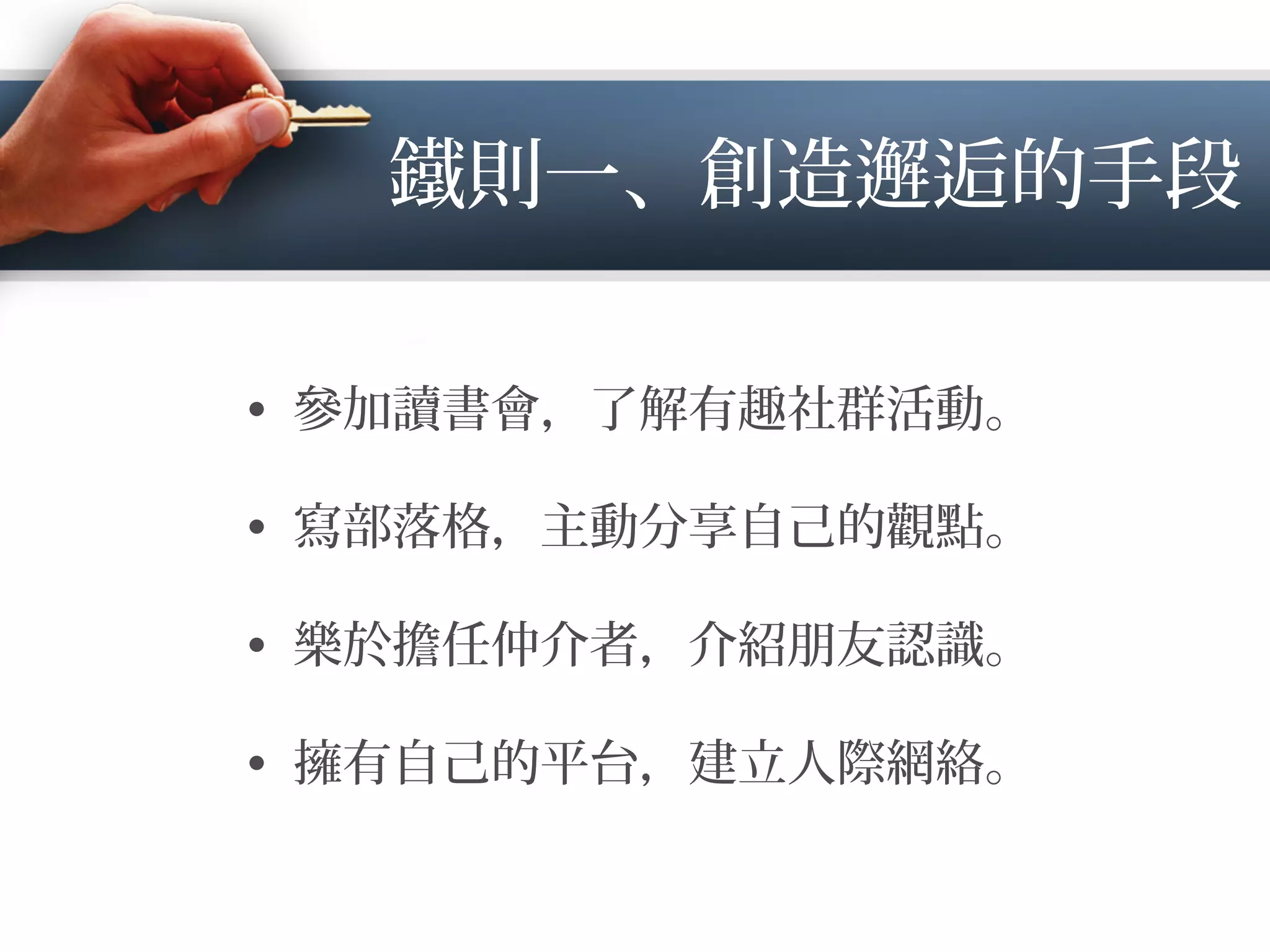 本文介绍了六个建立人脉的原则,包括创造相遇、贡献价值、关注他人需求、最大努力提供帮助、珍视真正的关系以及珍惜老朋友。强调与志同道合的人结盟,以及通过帮助他人来获得回馈。人际关系的维护应以深交和相互支持为基础。