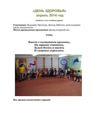 В апреле 2014 года в детском саду прошел «день здоровья» для средней и младшей группы, включавший зарядку, эстафеты и обсуждения о гигиене и здоровом питании. Участники путешествовали по станциям, где занимались физической активностью, учились о гигиене и безопасности, а также обсуждали позитивные эмоции. В конце мероприятия был получен совет от доброго доктора Айболита о важности холодной воды и спорта для укрепления здоровья.