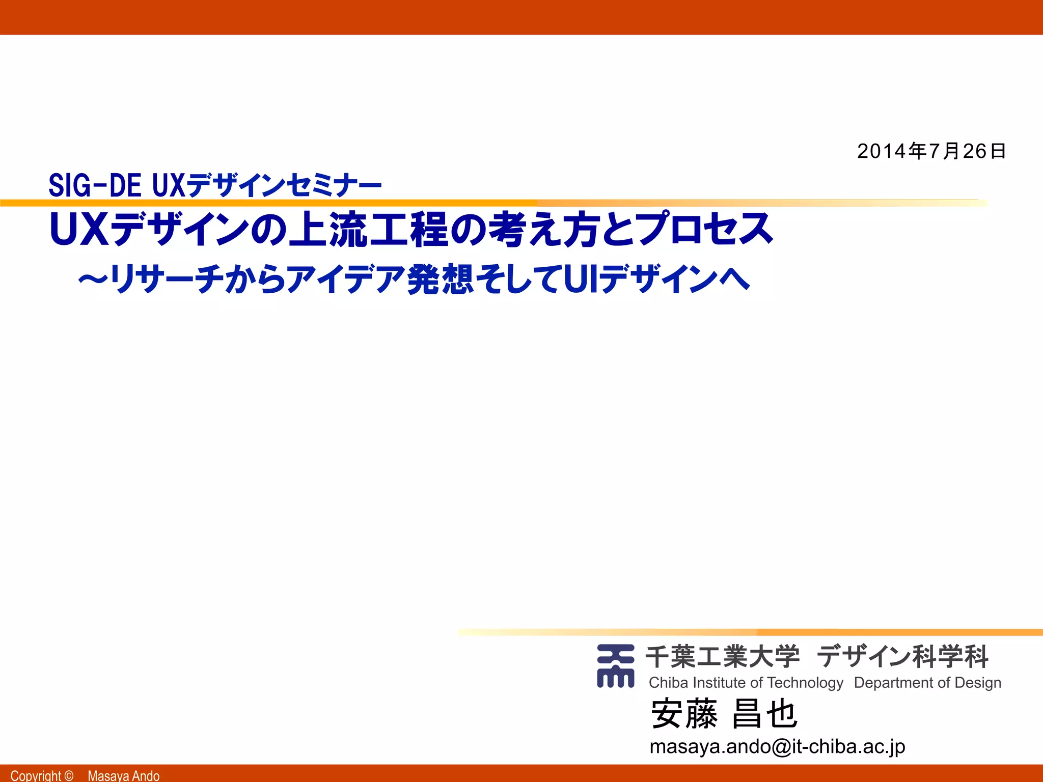 2014年7月26日 ヒューマンインタフェース学会SIG-DE UXデザインセミナー@IMJ ユーザー調査で得られた結果から、アイデア発想を行い、UXコンセプトツリーを作成を行うまでの一連の流れをワークショップで学びました。