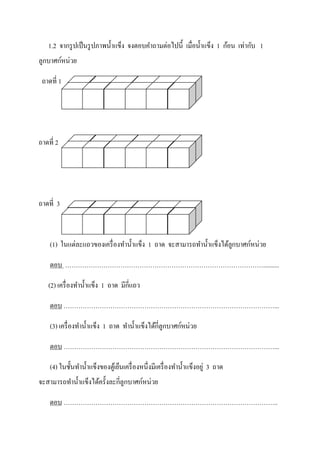 8 เซนติเมตร ยาว 12 เซนติเมตร สูง 5 เซนติเมตร จะมีความจุกี่ลูกบาศก์เซนติเมตร ………………………………………………………………………………………………… ………………………………………………………………………………………………… ………………………………………………………………………………………………… ………………………………………………………………………………………………… ………………………………………………………………………………………………… ………………………………………………………………………………………………… 3.2 ถังน้าทรงสี่เหลี่ยมมุมฉากวัดภายในได้ความกว้างความยาว และความสูงได้เท่ากันคือ 75 เซนติเมตร ถังน้าใบนี้จะมีความจุกี่ลูกบาศก์เซนติเมตร ………………………………………………………………………………………………… ………………………………………………………………………………………………… ………………………………………………………………………………………………… ………………………………………………………………………………………………… ………………………………………………………………………………………………… ………………………………………………………………………………………………… 3.3 แท็งก์น้าใบหนึ่งวัดความกว้างได้ 3 เมตร ยาว 3 เมตร และสูง 2 เมตร ถ้าแท็งก์น้าใบนี้มีน้าบรรจุอยู่ครึ่งแท็งก์ น้าในแท็งก์น้านี้จะมีปริมาตรกี่ลูกบาศก์กืเมตร ………………………………………………………………………………………………… …………………………………………………………………………………………………