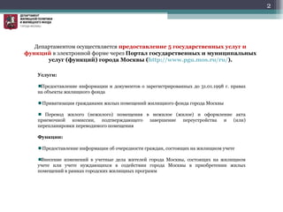 Департамент жилищной политики и жилищного фонда города Москвы предоставляет 5 государственных услуг в электронной форме через портал государственных и муниципальных услуг. За 7 месяцев текущего года количество запросов на услуги увеличилось на 75 %, что подтверждает высокий интерес граждан к электронным сервисам. Основные услуги включают приватизацию жилых помещений, перевод жилых и нежилых помещений, а также предоставление информации о жилищном учете.