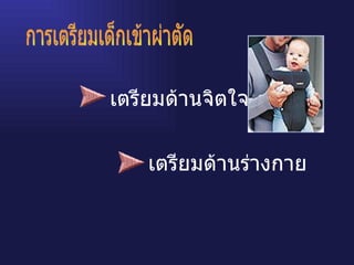 แรกเกิด-เตาะแตะ (0-3 ปี)เด็กวัยนี้จะมี Separate Anxiety สูงกว่าวัยอื่นๆ จะแสดงออกโดยการต่อต้าน ( Protest) หรือถดถอย เมื่อไม่พอใจ Intervention ให้ครอบครัวมีส่วนร่วม และเพิ่มความมั่นใจกับเด็กว่าจะไม่ทิ้งเด็ก ให้ความจริงกับเด็กในเรื่องง่ายๆ หาของเล่นที่เด็กชอบมาให้เล่น เล่านิทาน สันทนาการตามวัย - 5.