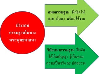 • วิปัสสนากรรมฐาน เป็นวิธีการฝึกจิตให้เข้าไปเกี่ยวข้องกับสิ่ง