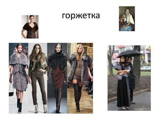 В документе рассматриваются различные виды верхней одежды, которые помогают выделиться из толпы и производят яркое впечатление. Упоминаются классические модели, такие как горжетки, пончо, тренчкоты и косухи, а также традиционная русская одежда и японская добука. Документ также включает информацию о знаменитом дизайнере обуви Стюартe Вайтцманe и его культовых босоножках.