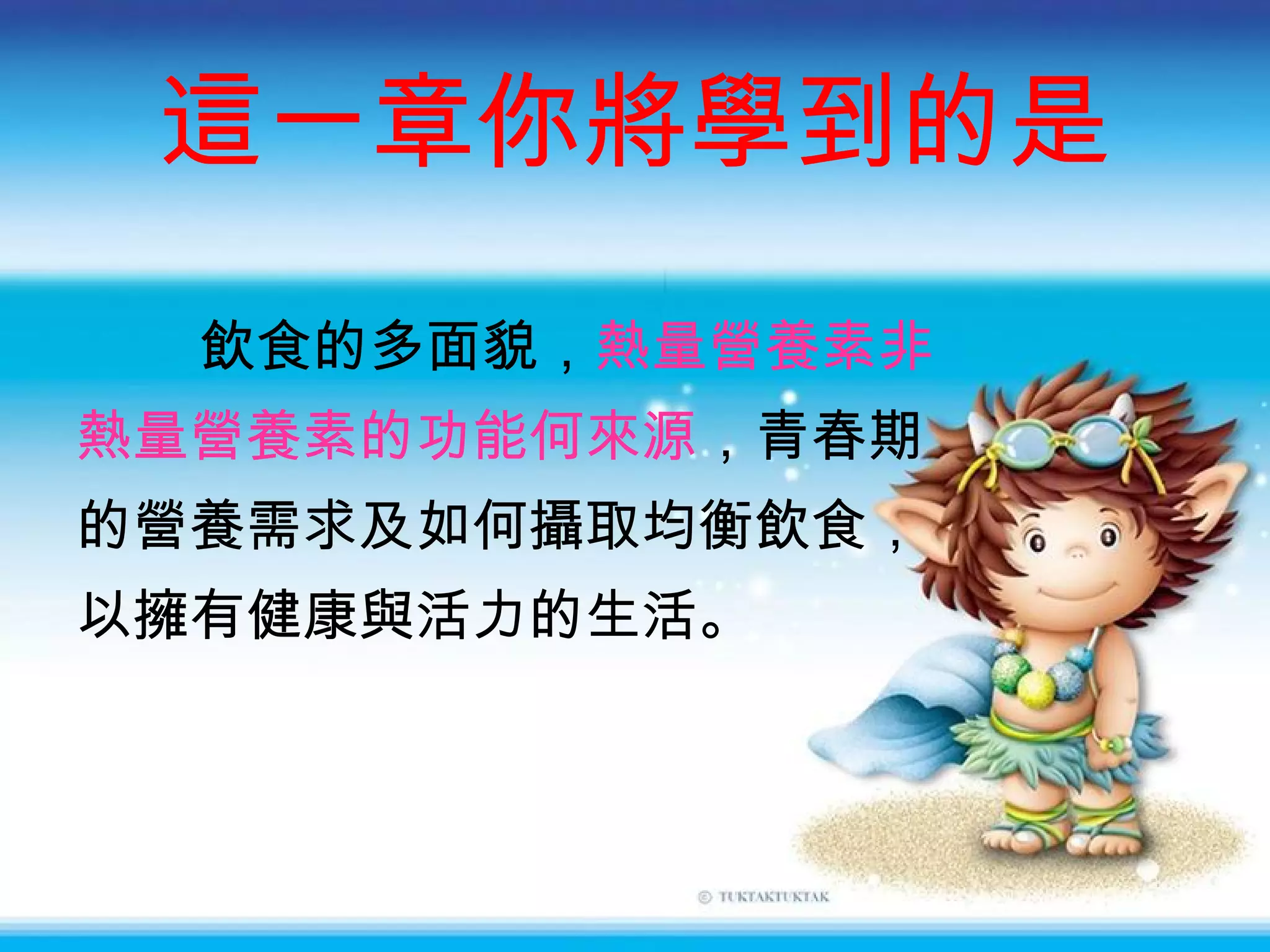 本章介绍了饮食的多样性和营养素的功能,强调青春期的营养需求与如何获得均衡饮食以保持健康和活力。主要讨论了热量营养素(如糖类、蛋白质、脂肪)和非热量营养素(如维生素、矿物质和水)的重要性,并提供了健康的饮食习惯建议。最后鼓励读者掌握营养知识,做出明智的饮食选择以促进身体健康成长。
