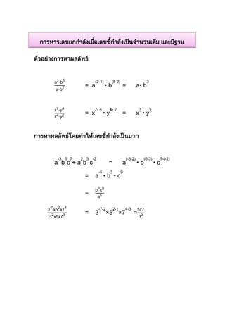 การหารเลขยกกาลังเมื่อเลขชี้กาลังเป็นจานวนเต็ม และมีฐาน เดียวกันให้นาเลขชี้กาลังมาลบกัน ตัวอย่างการหาผลลัพธ์ a2 b5 a