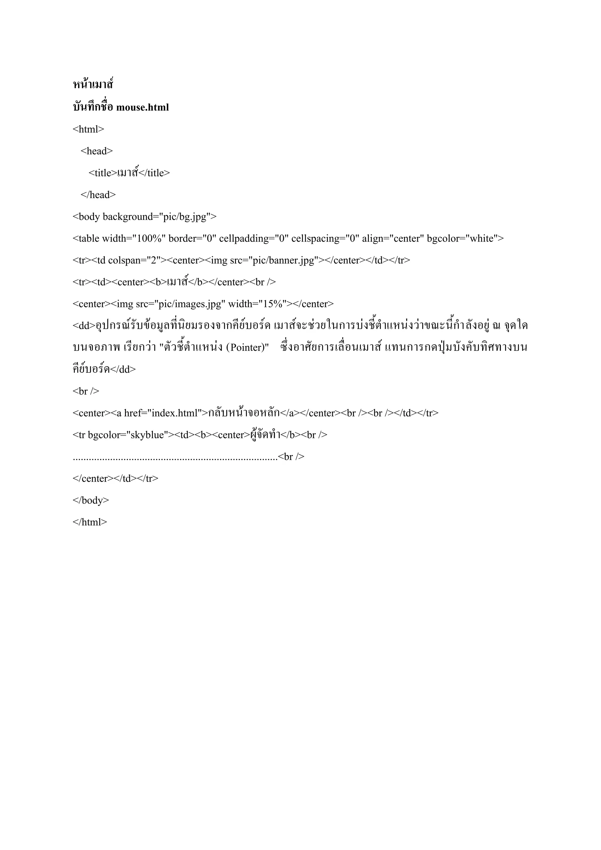 หน้าโฮมเพจ บันทึกชื่อ index.html <html> <head> <title>อุปกรณ์คอมพิวเตอร์</title> </head> <body background="pic/bg.jpg"> <table width="100%" border="0" cellpadding="0" cellspacing="0" align="center" bgcolor="white"> <tr><td colspan="2"><center><img src="pic/banner.jpg"></center></td></tr> <tr><td width="25%"><center><b><u><font size="3">เมนู</font></u></b></center> <ul> <li><a href="mouse.html">เมาส์</li> </ul> <br /> <center><b><u><font size="3">Weblink</font></u></b></center> <ul> <li><a href="http://krupiyadanai.wordpress.com" target="_blank">เรียน ICT ง่าย ง่าย สไตล์ครูปิยะดนัย </a></li> </ul> </td> <td><center><b>คอมพิวเตอร์</b></center><br /> <dd>คอมพิวเตอร์เกิดจากการนาเอาอุปกรณ์ต่าง ๆ มาประกอบเข้าด้วยกันเพื่อให้สามารถใช้งานได้ที่เรียกว่า คอมพิวเตอร์แบบตั้งโต๊ะ</dd> <center><img src="pic/10240872_0.jpg" width="50%"></center><br /><br /></td></tr> <tr bgcolor="skyblue"><td colspan="2"><b><center>ผู้จัดทา</b><br /> .............................................................................<br /> </center></td></tr> </body> </html>