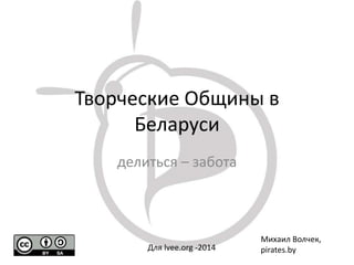 Документ обсуждает проблемы копирайта в Беларуси и предлагает возможные решения через создание творческих общин. Основные тезисы включают негативное влияние копирайта на культурный обмен и необходимость альтернативного законопроекта, разработанного через краудсорсинг. Ожидается, что успешные усилия приведут к переводу лицензий на белорусский язык и установлению открытых коммуникаций с госорганами.