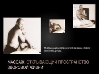 Документ описывает трехмерный вибрационно-волновой массаж, разработанный Евгением Атановым, который направлен на гармонизацию тела, сознания и души через работу с энергией мандал. Это уникальная методика сочетает элементы японских массажных практик, багуа и цигун, обеспечивая глубокое воздействие на организм. Основное отличие заключается в использовании трехмерного пространства, что способствует более качественному и тонкому воздействию на здоровье человека.