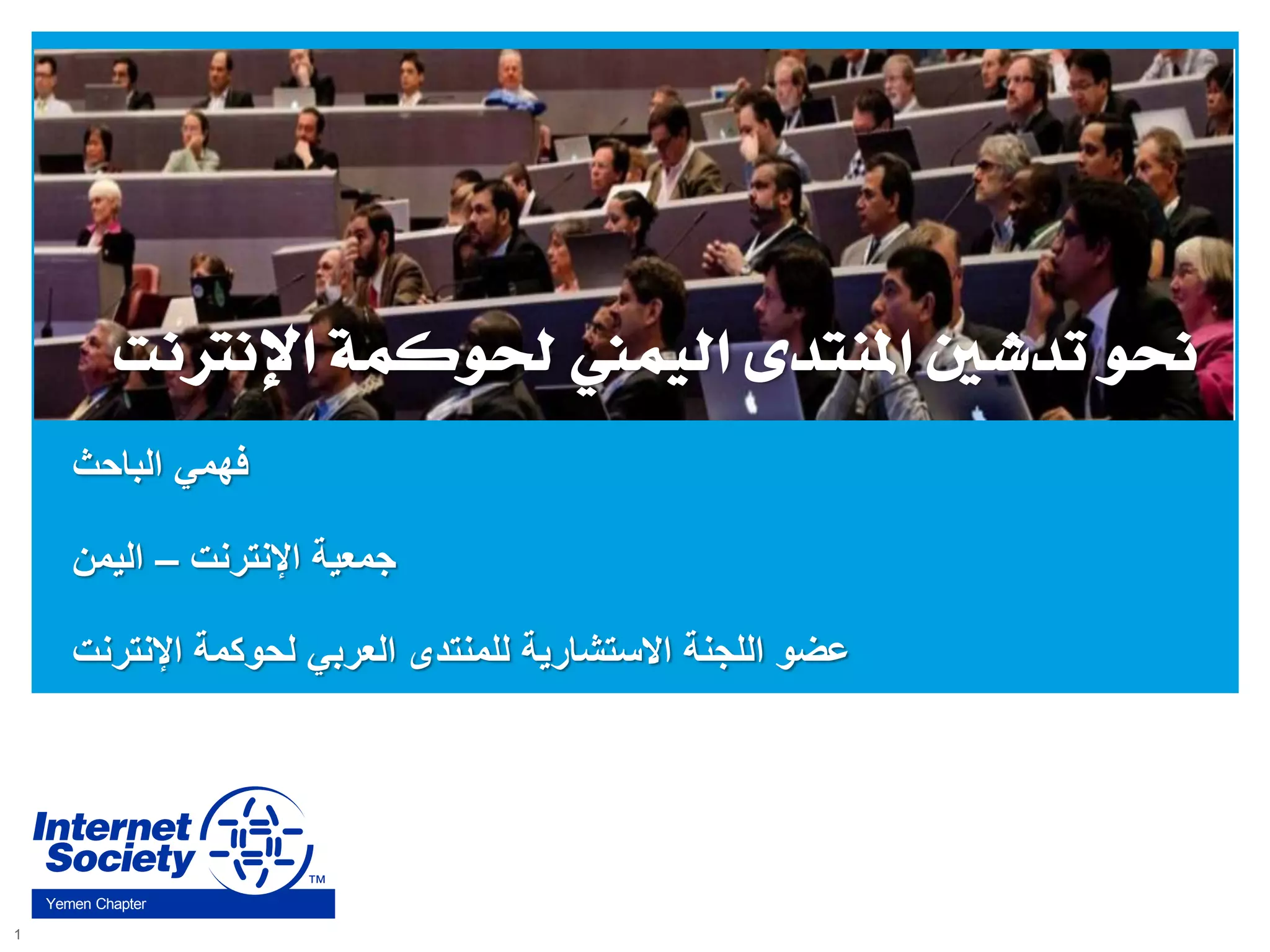 تتحدث الوثيقة عن تدشين منتدى لحوكمة الإنترنت في اليمن، حيث يتناول أهمية الحوار بين أصحاب المصلحة المختلفة لتعزيز الاستقرار والأمن في بيئة الإنترنت. كما تشير إلى الحاجة إلى منصة مستقلة لمعالجة القضايا المتعلقة بالوصول والخصوصية والحماية. ومن المقرر عقد المنتدى في إسطنبول في سبتمبر 2014.
