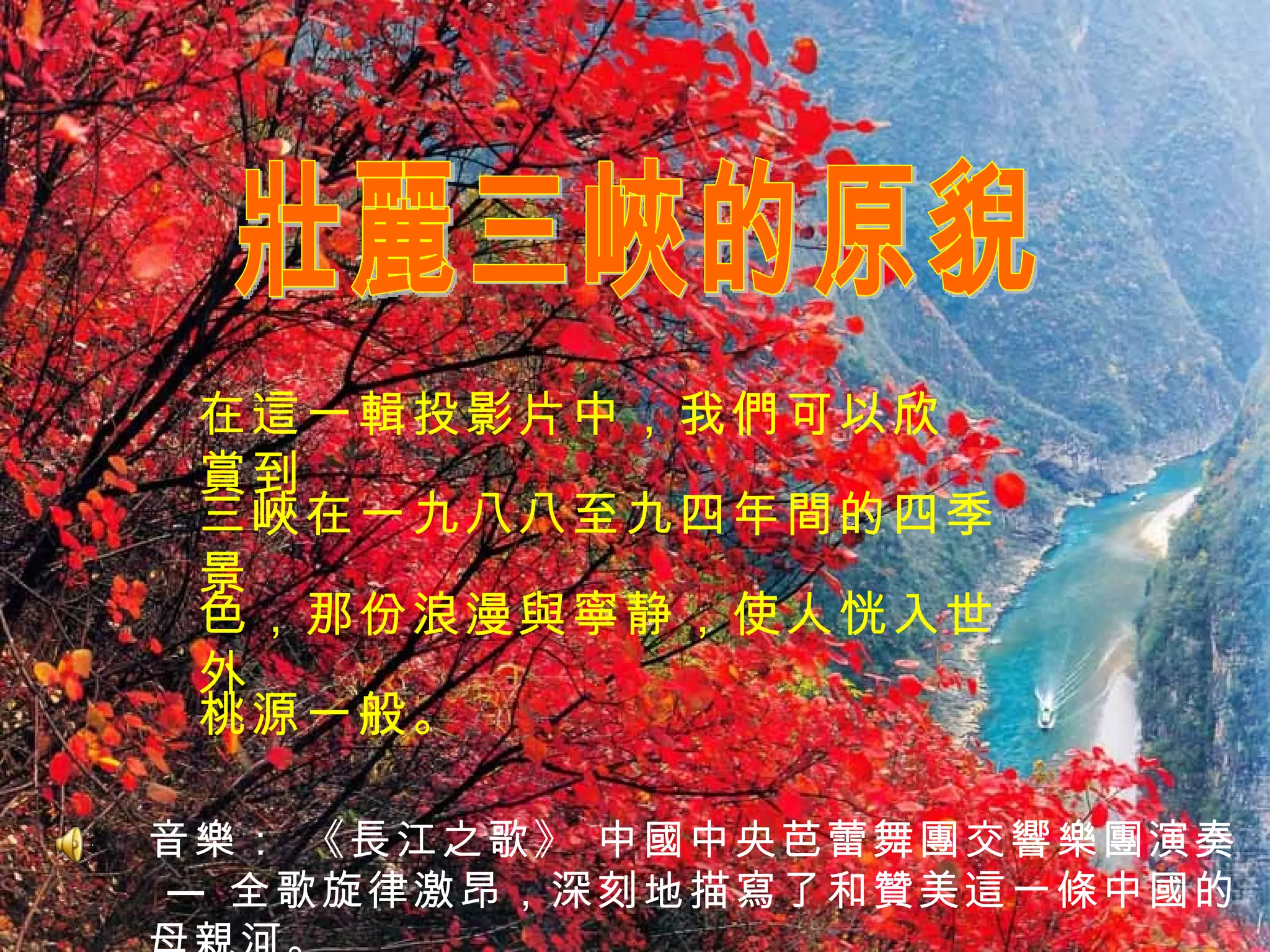 该文档展示了1988至1994年三峡壮丽景色的幻灯片,描述了诗人李白的足迹并赞美了长江。自1997年长江开始分期蓄水,三峡的传统景观逐渐消失,历史人文和自然风景淹没在水底。文档还介绍了三峡的主要峡谷、自然景观及其历史遗迹。