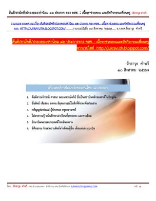 ของ คสช. : เนื้อหาช่วยสอน และจัดกิจกรรมเพื่อนครู ( จักราวุธ คาทวี ) โดย....จักราวุธ คาทวี กศน.อาเภอสรรพยา สานักงาน กศน.จังหวัดชัยนาท JUKRAVUTH1@GMAIL.COM หน้า 1 รวบรวมจากบทความ เรื่อง สันติ/สามัคคี/ปรองดอง/ค่านิยม ๑๒ ประการ ของ คสช. : เนื้อหาช่วยสอน และจัดกิจกรรมเพื่อนครู จาก HTTP://JUKRAVUTH.BLOGSPOT.COM/ ……….รวบรวมไว้เมื่อ ๑๐ สิงหาคม ๒๕๕๗...... อ.ก.ค.ศ.จักราวุธ คาทวี สันติ/สามัคคี/ปรองดอง/ค่านิยม ๑๒ ประการของ คสช. : เนื้อหาช่วยสอนและจัดกิจกรรมเพื่อนครู จากเวปไซค์ http://jukravuth.blogspot.com/ จักราวุธ คาทวี ๑๐ สิงหาคม ๒๕๕๗