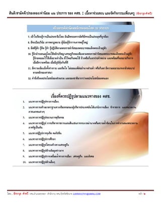 ของ คสช. : เนื้อหาช่วยสอน และจัดกิจกรรมเพื่อนครู ( จักราวุธ คาทวี ) โดย....จักราวุธ คาทวี กศน.อาเภอสรรพยา สานักงาน กศน.จังหวัดชัยนาท JUKRAVUTH1@GMAIL.COM หน้า 19 1.2.2 เคารพกันทางวาจา ได้แก่ การพูดให้เมาะสมกับกาลเทศะ การใช้คาพูดเหมาะสมตามฐานะของบุคคล การ พูดจาสุภาพ ไม่ก้าวร้าว ส่อเสียด การไม่พูดในสิ่งที่จะทาให้ผู้อื่น เกิดความเดือดร้อน ไม่นาความลับของบุคคลอื่นไปเปิดเผย ไม่พูด นินทาหรือโกหกหลอกลวง เป็นต้น 1.3 เคารพสิทธิของผู้อื่น - การไม่ล่วงละเมิดสิทธิของผู้อื่น ทั้งทางกายหรือวาจา - การรู้จักเคารพในสิทธิของคนที่มาก่อนหลัง - การเคารพในความเป็นเจ้าของ สิ่งของเครื่องใช้ - การรู้จักขออนุญาต เมื่อล่วงล้าเข้าไปในที่อยู่อาศัยของบุคคลอื่น - การไม่ทาร้ายผู้อื่นโดยเจตนา - การไม่ทาให้ผู้อื่นเสื่อมเสียชื่อเสียง เป็นต้น 1.4 เคารพในความคิดเห็นของผู้อื่น - การยอมรับฟังความคิดเห็นของผู้อื่น เมื่อมีผู้พูดเสนอความคิดเห็น ควรฟังด้วยความตั้งใจและใคร่ครวญด้วยวิจาร ญาณ หากเห็นว่าเป็นการเสนอแนวความคิดที่ดี มีประโยชน์มากกว่าความคิดเห็นของตนเองก็ควรยอมรับและปฏิบัติตาม - ไม่ควรยึดถือความคิดเห็นของตนว่าถูกเสมอไป 1.5 เคารพในกฎระเบียบของสังคม - การยึดมั่นในกฎระเบียบของสังคม เช่น วัฒนธรรมประเพณี กฎเกณฑ์ของสังคม และกฎหมายของประเทศ 1.6 มีเสรีภาพและใช้เสรีภาพในขอบเขตของกฎหมายและขนบธรรมเนียมประเพณี 2. การร่วมมือช่วยเหลือซึ่งกันและกัน มีความเอื้อเฟื้อเผื่อแผ่ต่อกัน เพื่อให้เกิดประโยชน์ต่อส่วนรวม มีพฤติกรรมที่แสดงออก ดังนี้ 2.1 การรู้จักประสานประโยชน์ โดยถือประโยชน์ของส่วนรวม หรือประโยชน์ของชาติเป็นที่ตั้ง ได้แก่ - การทางานร่วมกันอย่างสันติวิธี - การรู้จักประนีประนอม โดยคานึงถึงประโยชน์ที่เกิดขึ้นแก่ส่วนรวมเป็นใหญ่ - การเสียสละความสุขส่วนตน หรือหมู่คณะ เพื่อประโยชน์ของส่วนรวมหรือของชาติ 2.2 ร่วมมือกันในการทางาน หรือทากิจกรรมอย่างหนึ่งอย่างใดร่วมกัน โดยมีบุคคลผู้ร่วมงาน ตั้งแต่ 2 คนขึ้นไป ในการ ทางานร่วมกันนี้ จะต้องมีการวางแผนในการทางานร่วมกัน เมื่อถึงขั้นตอนของการทางานก็ช่วยเหลือกันอย่างตั้งใจ จริงจัง ไม่หลีกเลี่ยง หรือทาแบบเอาเปรียบผู้อื่น 2.3 เห็นแก่ประโยชน์ส่วนรวม 2.4 รับผิดชอบต่อหน้าที่ ที่ได้รับมอบหมายจากส่วนรวมและหน้าที่ต่อสังคม 2.5 ความเป็นน้าหนึ่งใจเดียวกันของคนในกลุ่ม ในหน่วยงานและสังคม 3. การใช้สติปัญญาในการดาเนินชีวิต มีพฤติกรรมที่แสดงออก ดังนี้ 3.1 การไม่ถือตนเป็นใหญ่ - การรู้จักรับฟังความคิดเห็นของผู้อื่น - การยอมรับฟัง และ
