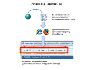 Документ описывает установку и функции надстройки для браузера, которая позволяет подключаться к различным базам знаний и участвовать в обмене знаниями. В нем также упоминаются возможности интеллектуального анализа данных, такие как история просмотров научных публикаций, семантический анализ и динамика публикаций. Дополнительно рассматриваются источники данных и основные характеристики публикаций, включая распределение по годам, авторам и журналам.