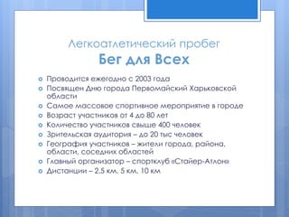 Легкоатлетический пробег 'Бег для всех' проводится ежегодно с 2003 года в Первомайском и объединяет участников разных возрастов от 4 до 80 лет, привлекая более 400 бегунов и до 20 тыс. зрителей. Организатором мероприятия является спортклуб 'Стайер-Атлон', предлагающий различные дистанции - 2,5 км, 5 км и 10 км. Документ также описывает рекламные возможности для спонсоров, такие как размещение логотипов и упоминания в медиа.