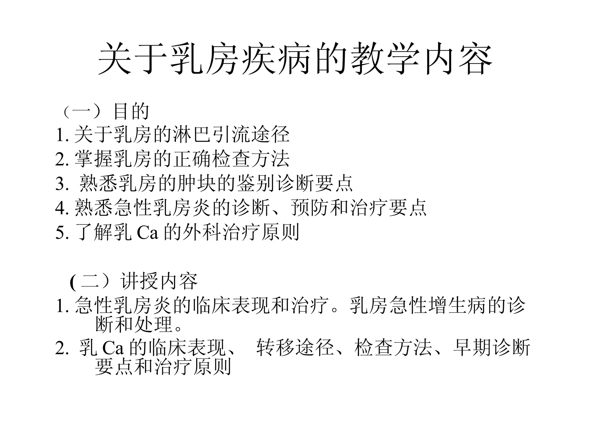 二、病因 1 . 产后全身抗病能力下降; 2 . 乳汁淤积—重要原因—因淤积的乳汁有利于细菌的生长繁殖。 导致乳汁淤积的原因有三: a. 乳头发育不良(过小或内陷),妨碍哺乳 b. 乳汁过多或婴儿吸乳少,以至乳汁不能完全排空 c. 乳管不通,影响排乳 3 . 细菌入侵 a. 乳头破损,致使细菌沿淋巴管入侵是感染的主要途径。 b. 婴儿含乳头而睡,或患有口腔炎而吸乳,也有利于细菌直接入侵乳管。 致病菌:以金黄色葡萄球菌为主