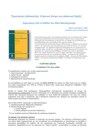 Κοιςική Σκέψη ρςη Διδακςική Ποάνη", Ρημειώρειπ από ςξ βιβλίξ ςξσ Ζλία Λαςραγγξύοα Αθήμα, Gutenberg, 2002 Δπιμέλεια, Διξμ.Ι.Οαοξύςραπ Ξ Ηλίαπ Μαςραγγξύοαπ είμαι καθηγηςήπ διδακςικήπ ρςξ Παιδαγωγικό Τμήμα Δημξςικήπ Εκπαίδεσρηπ ςξσ Παμεπιρςημίξσ Αθημώμ. Με κεμςοικό άνξμα επιρςημξμικήπ εμαρχόληρηπ ςη θεωοία και ςημ ποάνη ςηπ εκπαίδεσρηπ και ςηπ διδαρκαλίαπ έχει αρχξληθεί με ςημ κοιςική ρκέψη, ςη ρςξχαρςικξκοιςική ποξρωπική θεωοία διδαρκαλίαπ, ςη διαθεμαςική ρχξλική γμώρη, ςημ κειμεμξκεμςοική ποξρέγγιρη ςξσ γοαπςξύ λόγξσ, ςξμ ρχξλικό εγγοαμμαςιρμό, ςημ ξμαδξρσμεογαςική διδαρκαλία και ςημ ξογάμωρη ςηπ ρχξλικήπ ςάνηπ. Διαςέλερε αμςιποόεδοξπ ςξσ Παιδαγωγικξύ Ιμρςιςξύςξσ και ποόεδοξπ ςξσ ςμήμαςξπ ποωςξβάθμιαπ εκπαίδεσρηπ καςά ςξ παοελθόμ, θέρη ρςημ ξπξία σπηοεςεί και καςά ςξ παοόμ διάρςημα. Σςα δημξριεύμαςά ςξσ ρσγκαςαλέγξμςαι και ςα παοακάςω βιβλία: - Η ρχξλική ςάνη (2001) - Ομαδξρσμεογαςική διδαρκαλία και μάθηρη (2000) - Θεωοία ςηπ διδαρκαλίαπ (1999) - Σςοαςηγικέπ διδαρκαλίαπ (2000) - Η ενέλινη ςηπ διδακςικήπ (επιμ. 1995). Ζ ΙΠΘΘΙΖ ΡΙΔΦΖ Α ΙΘΜΖΛΑΑ ΞΣ 20ξσ ΑΘΩΜΑ ξ παοαδξριακϊ ρυξλείξ είυε ςα ενήπ υαοακςηοιρςικά: 1. Ρσγκεμςοχςιρμϊ – Ασςαουικϊςηςα 2. Υοήρη πξιμόμ – αμξιβόμ 3. Ρσρρόοεσρη γμόρεχμ 4. Τοξμιμαςιρςικϊ ποξραμαςξλιρμϊ Ρε αμςιπαοάθερη με ασςϊ ήοθε ςξ κίμημα ςηπ ΜΔΑΡ ΑΓΩΓΖΡ ρςιπ αουέπ ςξσ 20ξσ αιόμα για μα σπάονει έμα μικοϊ πιρχγϋοιρμα ρςα 1970 με ςξ Back to Basics (3R), υχοίπ ϊμχπ θεχοηςικϊ σπϊβαθοξ, απλά ρσμςηοηςικέπ θέρειπ. Δπειδή ςξ κίμημα είμαι νεκάοτχςξ, δημιξσογήθηκε επιρςημξμικά ςεκμηοιχμέμξ ςξ κίμημα ςηπ Απξςελερμαςικήπ Διδαρκαλίαπ ςξ ξπξίξ σπξρςηοίζει ϊςι ξ δάρκαλξπ έυει μεγάλα πεοιθόοια παοέμβαρηπ εμάμςια ρςημ κξιμχμική δσμαμική πξσ καθξοίζει ςξ πξια παιδιά θα ποξκϊφξσμ και πξια ϊυι. Ιϋοιξπ εκτοαρςήπ είμαι εδό ξ οιαλιαμϊπ, ένχ ξι Brookover, Martimor κλπ. Βγάζξσμ και πεοιξδικϊ «School of effectiveness and School of improvement». Απϊ ςη ΜΔΑ ΑΓΩΓΖ, ποξέκσφαμ ξι ενήπ δϋξ θεχοίεπ: α. Ξμαδξρσμεογαςική διδαρκαλία (Vygotsky) β. Ιοιςική Ρκέφη πξσ υχοίζεςαι ρε 1. Γεμική Οαιδεία 2. Διδικά μαθήμαςα γμχρςικόμ Δενιξςήςχμ Για ςημ ξμαδξρσμεογαςική διδαρκαλία θα μιλήρξσμε παοακάςχ. Ξ ΙΘΜΖΛΑ ΖΡ ΙΠΘΘΙΖΡ ΡΙΔΦΖΡ Οοχςαουική απξρςξλή ςξσ Ρυξλείξσ η αμάπςσνη ςηπ κοιςικήπ ρκέφηπ. ξμ ποϊςειμε ξ Deweyρςιπ αουέπ ςξσ αιόμα αλλά παοαμεοίρςηκε με ςημ επικοάςηρη ςξσ μπιυεβιξοιρμξϋ με απξςέλερμα μα αγμξηθεί η ερχςεοική ποξρπάθεια ςξσ μαθηςή. Λε ςημ επικοάςηρη ςηπ Γμχρςικήπ Φσυξλξγίαπ επαμήλθε ρςξ ποξρκήμιξ. Οαοάλληλα και με ςημ απξςσυία ςξσ “back to basics”, αμαπςϋυθηκε ςξ κίμημα ςηπ Ιοιςικήπ